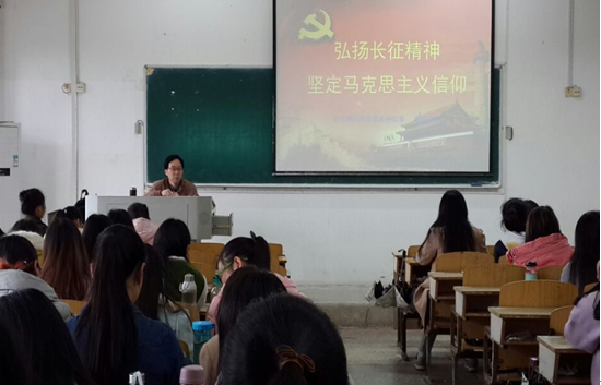 在报告中,颜宏启主任首先从长征精神的意义入手,系统梳理了习近平总书记对长征精神的多次具体阐述,然后运用大量的史料和数据详尽地介绍了长征发生的背景,以及红四军和红二十五军在长征中所作的突出贡献,论述了长征精神的重要意义及其对今天我们坚定马克思主义信仰的重要启示。颜宏启主任的报告富有历史感和黄冈红色文化研究价值,使学生对黄冈历史文化以及对本学期马克思主义基本原理课堂上所学习的历史唯物主义的重要观点有了更加直观而深入的理解。