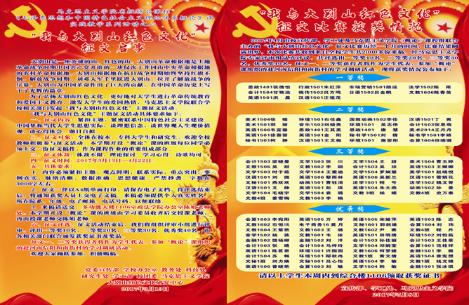 为了弘扬大别山红色文化,更好地对大学生进行革命传统教育和爱国主义教育,激发大学生的爱国热情,海角首页社网页版联合学校相关部门发起“我与大别山红色文化”主题征文活动。征文活动由海角首页社网页版“毛泽东思想和中国特色社会主义理论体系概论”课程组承办。征文活动历时一个多月,得到了全校师生的大力支持,活动共收到征文稿件2481篇。5月12日,海角首页社网页版组织专家对征文进行了评选。共评出一等奖10名,二等奖20名,三等奖30名,优秀奖40名。