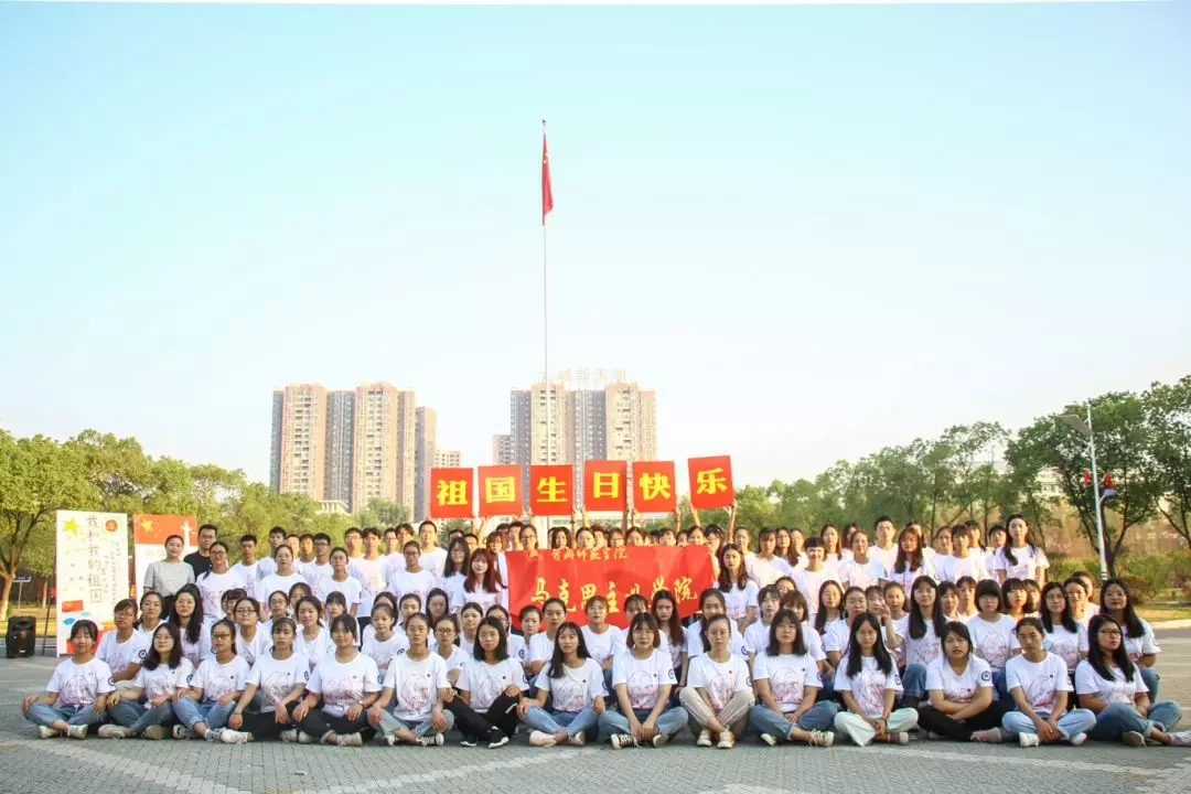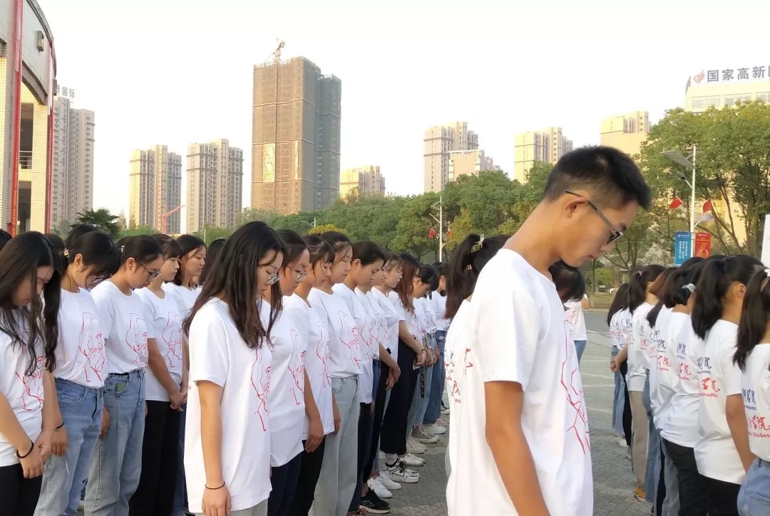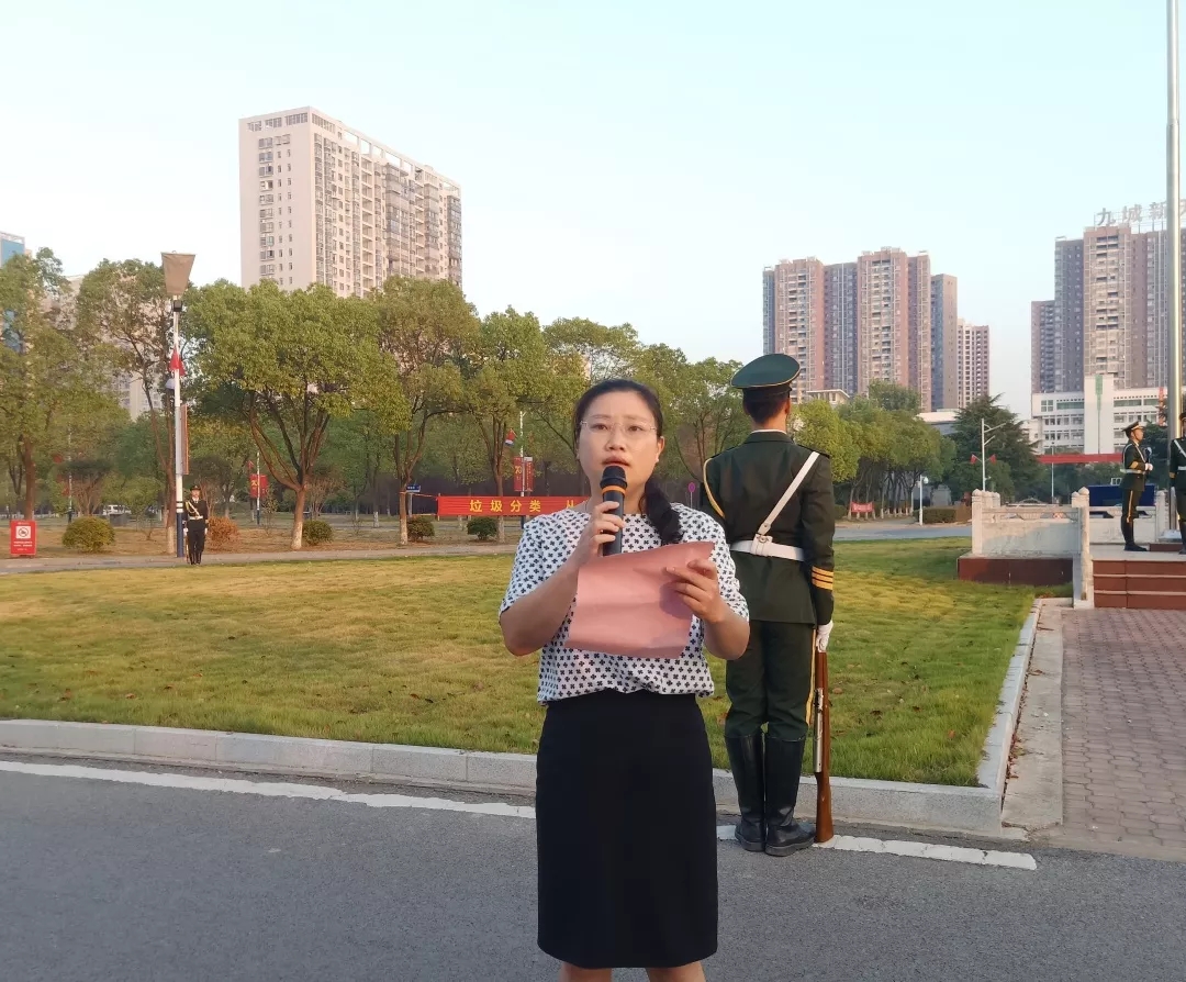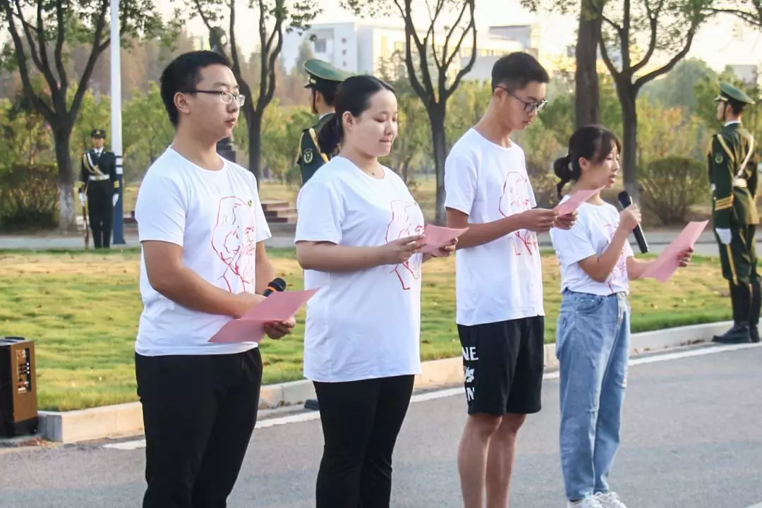 升国旗晨光平铺在红烛湖面上,在全院师生的注目礼下,英姿飒爽的国旗护卫队队员们护送鲜艳的五星红旗进场。伴随着庄严雄壮的中华人民共和国国歌奏响,鲜艳的五星红旗冉冉升起,全场师生肃立、屏住呼吸、目光注视着随着朝阳升起的五星红旗,表达着对祖国最崇高的敬意。