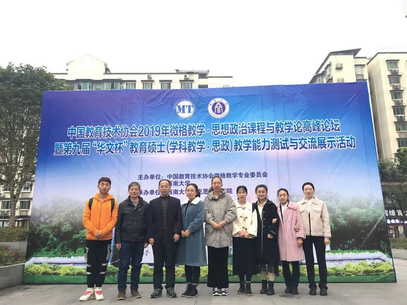 2019年11月29日至12月2日,由中国教育技术协会、西南大学主办,西南大学海角首页社网页版承办的2019年微格教学▪思想政治课程与教学论高峰论坛暨第九届“华文杯”教育硕士(学科教学▪思政)教学能力测试与交流展示活动成功举办。在潘松文和黄树光两位教授的带领下,我院硕士研究生王亚琪、王文婧、向菁菁和杨月参加了比赛,孙灿灿、张锋和余志烈三名同学参会观摩。