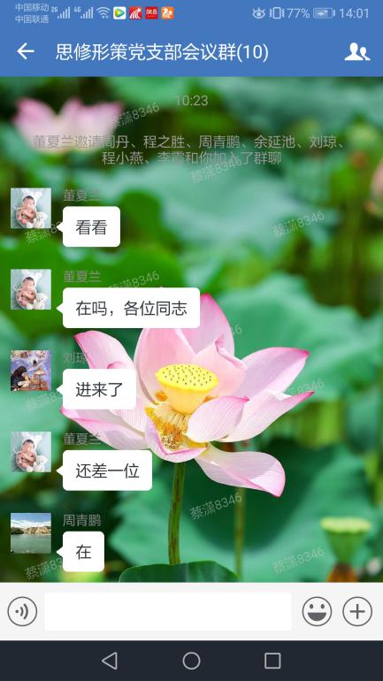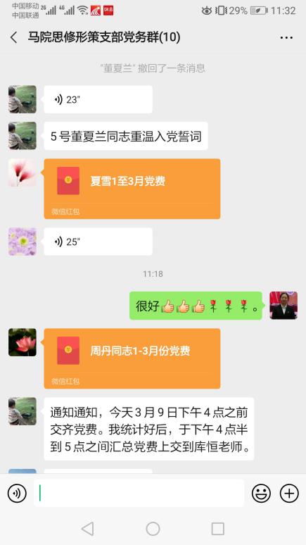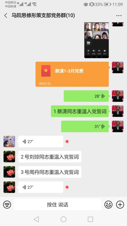 2020年3月9日,海角首页社网页版思修形策党支部进行了微信会议,党支部在线党员同志在组织委员和宣传委员组织下于上午10:30分进行了首次视频会议,虽然是第一次以党支部形式进行视频会议,但是到会的党员同志都没有迟到,并迅速进入了会议议程阶段。本次主题党日活动由全国样板党支部书记蔡潇同志主持,明确了本次主题党日的活动主题是:“慎终如始抓防控,时不我待促发展”,带头领学了习近平总书记《在决战决胜脱贫攻坚座谈会上的讲话》、《习近平在决战决胜脱贫攻坚座谈会上强调:坚决克服新冠肺炎疫情影响 坚决夺取脱贫攻坚战全面胜利》、《中共黄冈师范学院委员会 常务委员会 2020 年工作要点》、《黄冈师范学院 2020 年工作要点》。宣传委员周丹同志组织了战疫时期重温入党誓词活动,党支部10名党员同志全部重温了入党誓词,用语音和文字展现了不忘初心、牢记使命的历史任务。组织委员董夏兰同志组织了党支部党费收缴,以2020年1月党费收缴模板进行核算,收齐了党支部共1204元党费。完成规定动作后,党支部就近期学校疫情防控工作进行了讨论,强调要真正下沉一线,以全国样板党支部的标准来建设好党支部,认真完成好近期的网络教学工作,严格遵守学校出台的“十二严禁”、“四个不得有丝毫”、“四清”、“三不”、过好“三关”、提升“三力”、“四不”的疫情防控严格要求,以身作则贯彻好全面从严治党,向学校涌现出来的疫情防控先进学习,不断提升党支部和自身的政治素质、能力素质。
