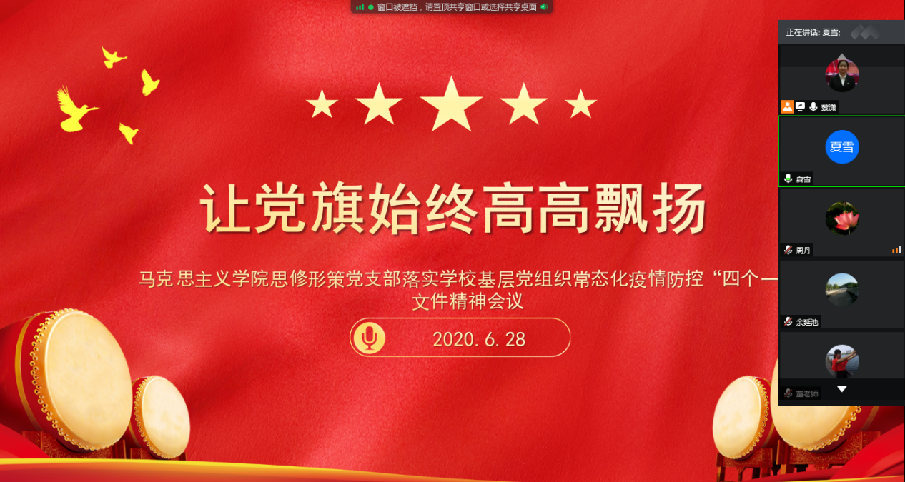 2020年6月28日下午,按照学校下发的《黄冈师范学院基层党组织常态化疫情防控“四个一”行动方案》要求,海角首页社网页版思修形策党支部进行了一场精彩的学习交流会,党支部同志们共同学习了文件精神,听取了微党课,进行了组织生活会并都发表了自己的看法和观点,进一步提高了思想认识,规划了2020年下半年工作。