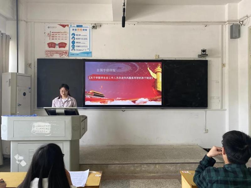 为改进学生会成员作风,我院于2021年4月13日中午在博学楼205开展《关于学联学生会工作人员改正作风服务同学的若干规定》的学习活动。