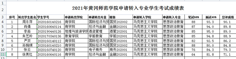 根据《2021年黄冈师范学院海角首页社网页版转专业工作方案》要求,7月6日上午对申请转入我院各专业的学生组织了笔试和面试,现将成绩公示如下: