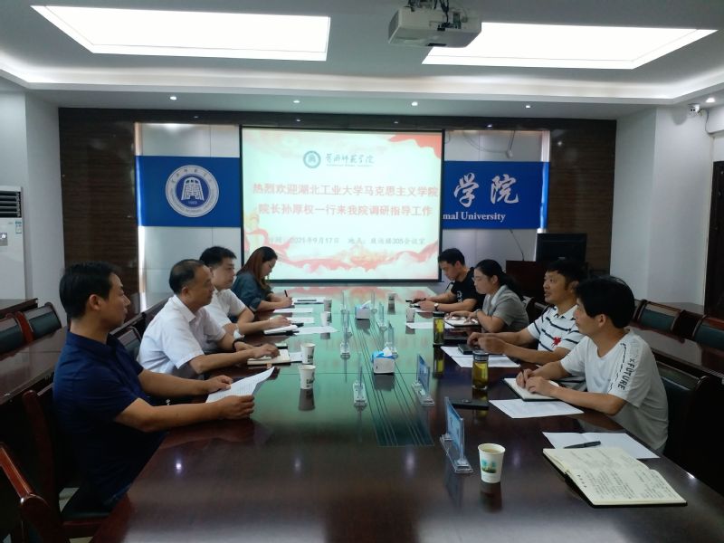 9月17日下午,湖北工业大学海角首页社网页版院长孙厚权、副院长韩东、马原教研室昌灏、研究生工作办主任吴迪娟等一行来我院交流调研。交流会在致远楼305会议室举行。我院院长汪季石、党总支副书记席桢、副院长王贵东、院长助理张传忠、院办公室主任宋明等出席了交流会。