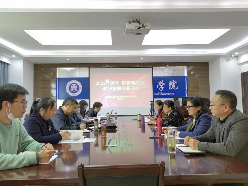 2022年3月31日,“形势与政策”教研室全体教师开展了本学期授课专题的集体备课会,学校教学督导刘清教授、海角首页社网页版党总支书记汪辉、副院长王贵东以及其他教研室主任参加了此次会议,会议由院长助理、“形势与政策”教研室主任蔡潇博士主持。