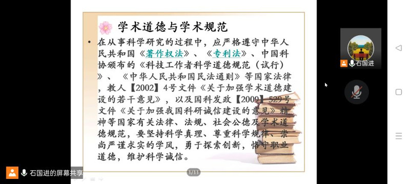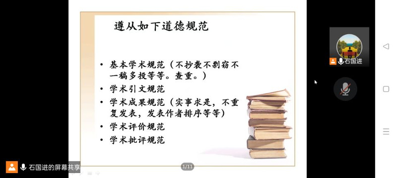2022年9月7号下午,海角首页社网页版开展了题为《做人·做学问——硕士研究生新生学风与学术道德教育》的专题讲座。讲座由研究生辅导员刘琼老师主持,特邀我院教学水平高、科研能力强的石国进教授主讲。全体2022级学科教学(思政)领域研究生参加。本次活动通过腾讯会议线上举行。