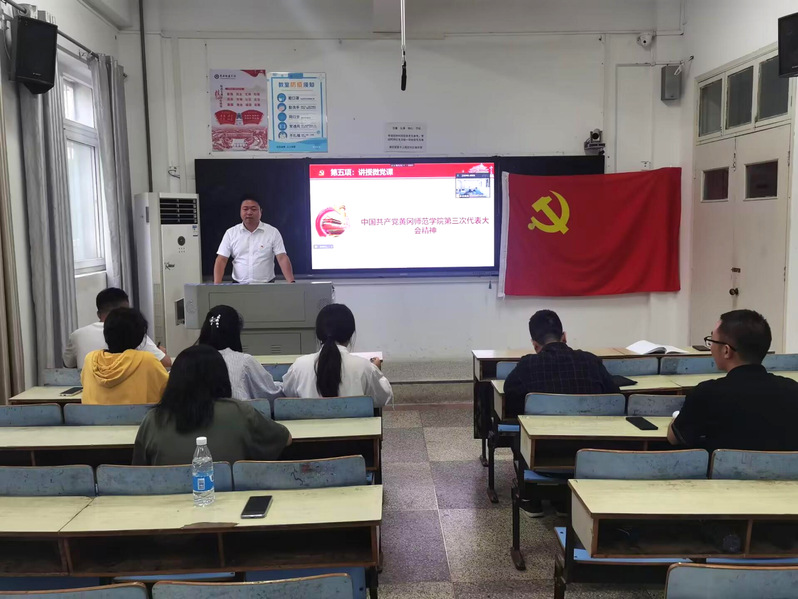 会议严格按照学校工作要求,完成学习内容和规定动作。会议第一部分,完成规定动作:全体参会成员共唱国歌;支部成员史庭龙带领全体党员重温入党誓词;闻雨晴同志领读党章第二章第十二条至第十五条;全体党员在复兴壹号平台按月足额交纳党费;支部书记讲授微党课中国共产党黄冈师范学院第三次代表大会精神,从党代会报告新提法“386战略”以及大会召开过程等方面进行了细致讲解。