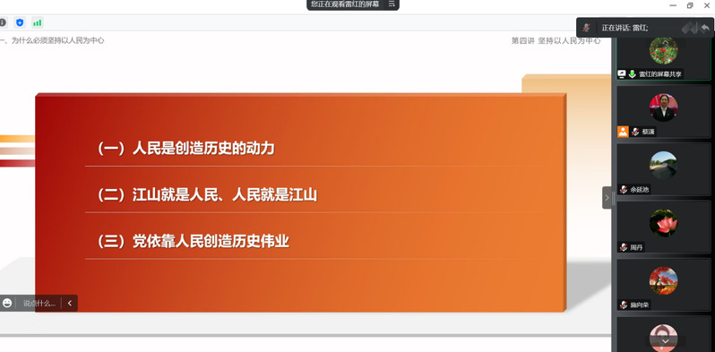 在完成交纳党费、唱国歌、重温入党誓词、诵读党章等规定动作后,进入理论学习环节。理论学习环节由王贵东副院长为党员同志们深入解读党的二十大报告基本内容和逻辑理论,阐明其中新提法和新观点,并要求同志们尽快深入学习党的二十大精神并把习近平新时代中国特色社会主义思想贯彻到教学中去,多讲授一些经典文献和经典语录,提升马克思主义理论学科鲜明学科特色。党支部书记蔡潇同志为同志们简要介绍了《习近平谈治国理政(第四卷)》的基本篇目结构和学习体会,并要求党支部同志们按时保质保量完成“四史”学习指定读本和《习近平谈治国理政(第四卷)》研学工作。余延池同志领学了党员下沉参与疫情防控有关政策常识和《中共黄冈师范学院委员会关于加强和改进新时代机关党建工作的实施意见》;董夏兰同志领学了《关于加强和改进新时代全民国防教育工作的意见》;周丹和夏雪同志领学了其他理论学习内容。党支部雷红同志讲授了主题为“以人民为中心”的学习贯彻二十大精神微党课。党支部十三位同志全部交流了学习感受和体会,都认为要尽快学习贯彻党的二十大精神,把学习贯彻党的二十大精神和学校中心工作相结合,做好本职工作,以昂扬的精神迈向新征程。