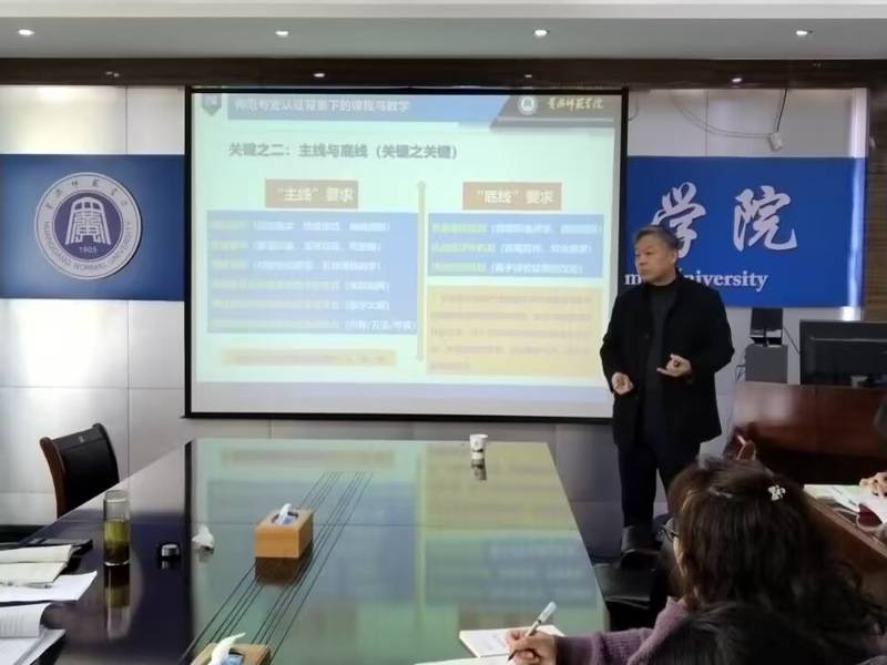 项教授首先从师范专业认证标准的三大核心理念——学生中心、产出导向、持续改进讲起,着重阐释了作为认证关键之关键的“主线”要求和“底线”要求。他结合自己作为师范专业认证专家的实践,对培养目标、毕业要求、课程目标、课程体系对毕业要求的支撑关系、课程目标对毕业要求的支撑关系和课程教学对课程目标的支撑关系六条“主线”要求逐一进行讲解,特别是提出了行之有效的对策建议。接着,他又分别剖析了作为“底线”要求的质量监控机制、达成度评价机制和持续改进机制三方面的考查重点。然后,他以自己所教授的《植物学》和《师范专业教育实践教学》两门课程为例,分别就课程目标的确定、教学目标的确定、教学设计与教法、课程目标的达成等做了示范性讲解,指导老师们结合自身实际来撰写课程教学大纲等认证材料。最后,他还对认证工作的流程设计与分进行了专业指导。