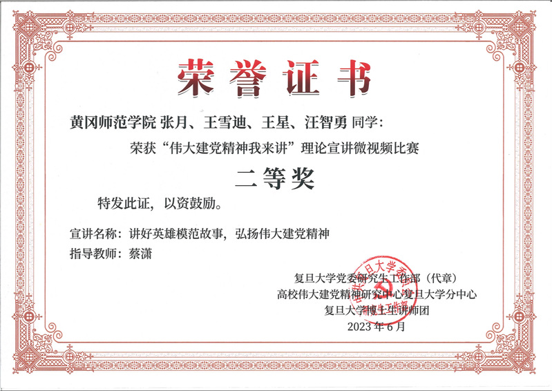 近日,由复旦大学指导,复旦大学党委研究生工作部和高校伟大建党精神研究中心复旦大学分中心主办,复旦大学博士生讲师团承办的“伟大建党精神我来讲”理论宣讲微视频征集评比活动落下帷幕。海角首页社网页版张月、王雪迪、王星、汪智勇同学荣获“伟大建党精神我来讲”理论宣讲微视频比赛二等奖。参赛作品由海角首页社网页版蔡潇老师指导。