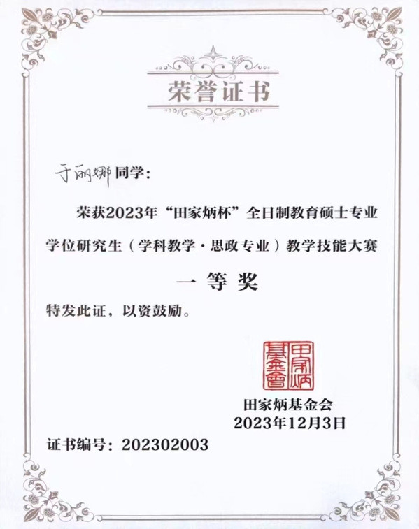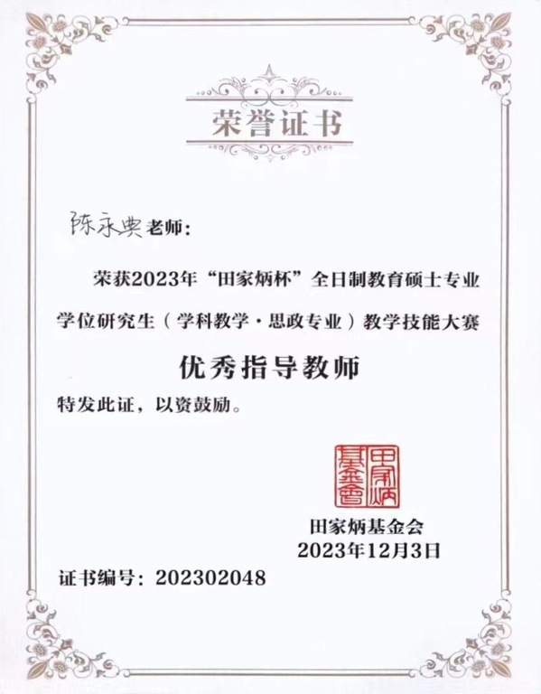 我校海角首页社网页版2021级学科教学(思政)专业于丽娜在2023年全国“田家炳杯”全日制教育硕士专业学位研究生学科教学(思政)教学技能大赛中荣获一等奖,陈永典老师获评优秀指导教师奖。
