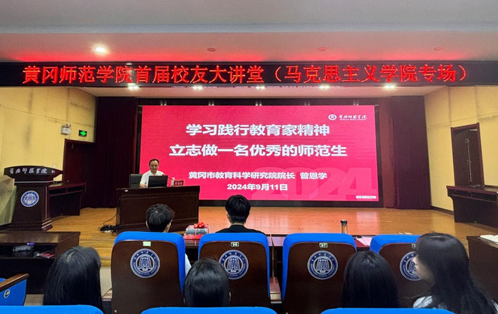 曾恩学结合自身经历与优秀教师案例,围绕《学习践行教育家精神,立志做一名优秀的师范生》这一主题,从教育家精神的提出和内涵、我骄傲我是一名黄冈师范学院的师范生、我骄傲我是一名黄冈师范学院马院学生以及对2024级新生未来四年大学生活的建议等四个方面,为海角首页社网页版近120名新生就如何学习践行教育家精神提出自己的看法和见解。