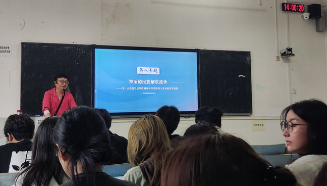 刘清教授作《神圣的民族解放战争——为什么说抗日战争的胜利是中华民族伟大复兴的历史转折》为主题的示范课教学。首先,针对美术专业学生多喜欢日本动漫影片的实际,刘教授讲述了日本民族的“菊与刀”矛盾性格和心理,提醒、告诫学生不要被日本动漫影片所展示的谦恭有礼的表象而蒙蔽。其次,刘教授讲述了日本大陆政策的缘起、日本帝国主义的野蛮侵略行径、给中国人民带来的深重苦难,教育学生牢记历史、勿忘国耻、奋力拼搏。第三,刘教授着重讲述了中国共产党作为抗日民族统一战线的宣传者、组织者、实践者的巨大功劳,深情讲述了在中国共产党优秀儿女代表赵尚志、杨靖宇、赵一曼、周保中、李兆麟等领导下东北抗日联军的英勇抗战、丰功伟绩和巨大牺牲,为后面将要进行的“中国共产党是抗日战争的中流砥柱”的学习作了很好的铺垫。
