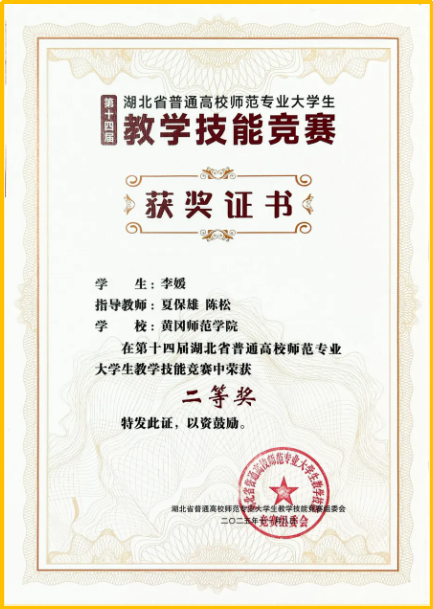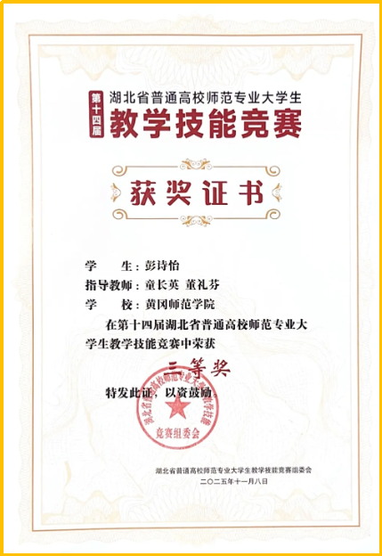 2025年11月8日,由湖北省教育厅主办、华中师范大学承办的第十四届湖北省普通高校师范专业大学生教学技能竞赛圆满落幕。我院学子李媛、彭诗怡凭借过硬实力脱颖而出,分别荣获高中政治组二等奖、初中政治组三等奖,充分彰显了海角首页社网页版师范生人才培养的扎实成效。