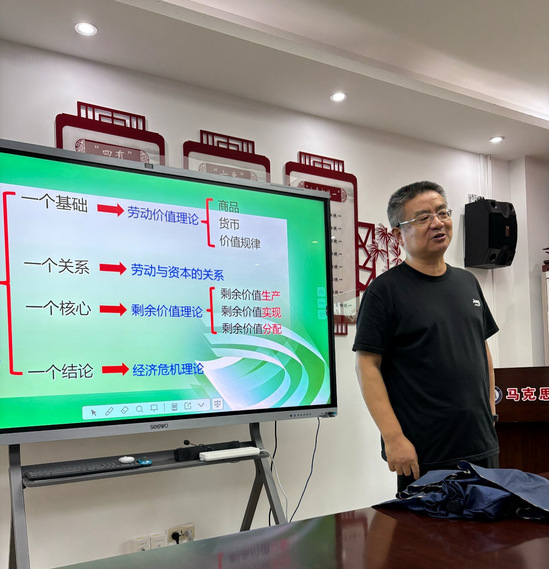 备课会上,夏保雄老师对马克思主义基本原理第四章“资本主义的本质及规律”的整体框架进行了系统的整理,把第四章主要内容概括为四个一,即一个基础—劳动价值论、一个关系—劳动与资本的关系、一个核心—剩余价值理论、一个结论—经济危机理论。与会教师结合教材逻辑,围绕劳动与资本的关系这个问题展开讨论,并从“商品二因素”“劳动二重性”等主要知识点入手,就如何将抽象理论转化为生动教学案例纷纷发表自己的见解。最后,老师们就马原课程中普遍存在的问题,如怎样提高学生的到课率、抬头率,提高课堂的教学效果等问题进行了讨论,